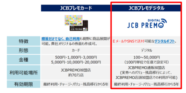 JCBプレモデジタルは、メールやSNSで贈ることができるデジタルギフトで、JCB PREMO加盟店のオンラインショッピング・ウェブサイトで利用できる。また、JCBプレモカードへのバリュー移行により、コンビニエンスストアや百貨店など全国70万店以上のJCB PREMO加盟店でも利用可能だ。