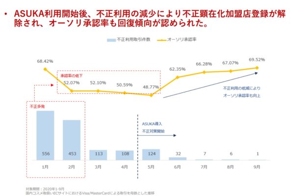 ある化粧品の会社の事例をご紹介します。化粧品は原価が低いので、チャージバックになっても痛手が小さいため、あまり気にしない、対策もとらないという会社も結構あります。ここも当初はそうでした。しかし徐々に被害が増えて、アクワイアラに不正顕在化加盟店として登録されることになりました。イシュアのオーソリ承認率も低下傾向になり、ついに50%以下まで落ちました。これによる販売機会損失は、チャージバックそのものの被害よりも大きいです。そこでこの会社では「ASUKA」を導入しました。不正が減って、不正顕在化加盟店登録を解除され、オーソリ承認率も回復したという非常にわかりやすい事例です。