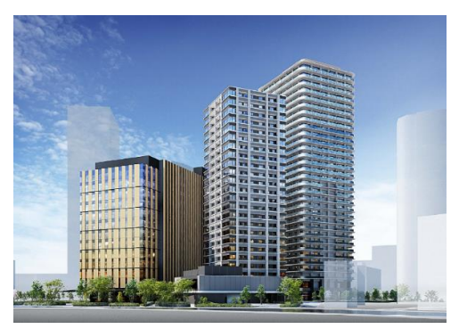 目黒 MARC 完成予想図:中央ビルが目黒 MARC レジデンスタワー(ビューカード)