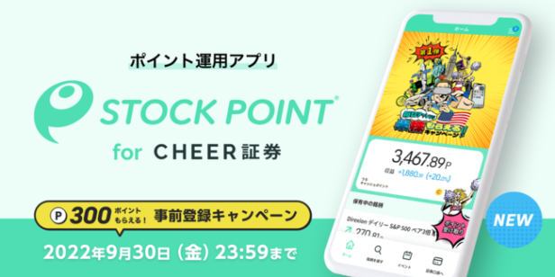 9月14日10 時~9月30日まで、「StockPoint for CHEER証券」アプリのゲームで使える300ポイントが受け取れる事前登録キャンペーンを実施(STOCK POINT)