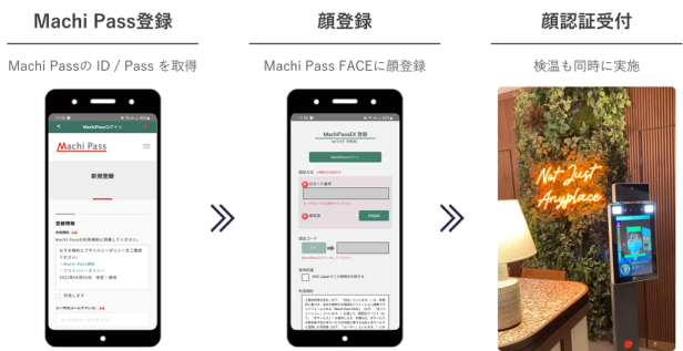 利用者はMachi Passを登録し、Machi Pass IDとパスワードを取得。施設受付にある登録端末でMachi Passで登録したIDとパスワードを入力し、顔画像登録する(DXYZ)
