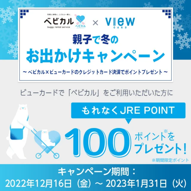 JREベビーカーシェアリング有限責任事業組合(組合員:JR東日本、ジェイアール東日本企画)は、子育て世帯が子供たちと気軽に外出できる社会の実現を目的として、外出先でも利用できる、予約可能なベビーカーレンタルサービス「ベビカル」を展開している。同取り組みでは、ビューカードと連携し、2022年12月16日~2023年1月31日まで、「親子で冬のお出かけキャンペーン ~ベビカル×ビューカードのクレジットカード決済でポイントプレゼント~」にてJRE POINTプレゼントキャンペーンを開催している。