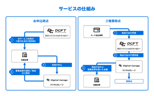同サービスは、DGの子会社で決済事業を手がけるDGフィナンシャルテクノロジーが提供する決済サービスの加盟店向けの招待制サービスだ。DG Labが独自に開発した「売上予測AIモデル」により、将来の加盟店売上(将来発生する予定の債権)を予測し、その一部をDGが買い取る。原則、決算書などの追加の審査資料の提出が不要で、最短5営業日で資金調達が可能だ。また、売却した債権は、毎月の加盟店の決済売上から一定率(譲渡率)を差し引くことで精算される。