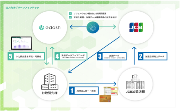 CO2排出量可視化のクラウドサービス「e-dash」を提供するe-dashは、ジェーシービー (JCB)と業務提携し、JCB法人カードの決済データに基づきCO2排出量を可視化する法人向けグリーンフィンテックの提供を開始する。