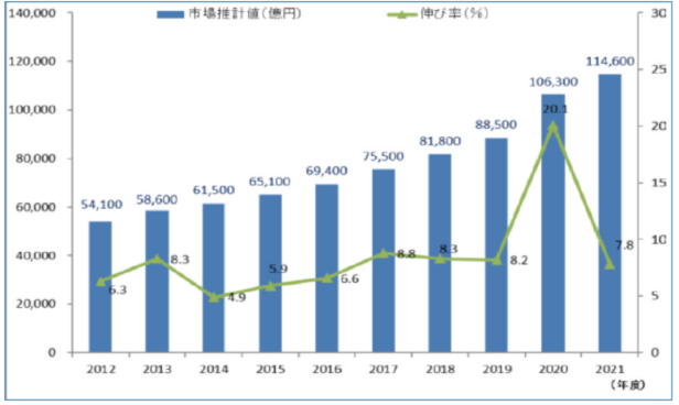 毎年8月にJADMA(日本通信販売協会)が実施する調査によれば、2021年度の通販・EC市場売上高(物販)(表1)は前年度比7.8%増の11兆4,600億円と初めて11兆円台に達した。巣ごもりの影響でEC を軸に通販による購入手法が定着し、市場の伸びを後押ししたとみられる。ただ、伸び率は前年度の特需には及ばず、12.3 ポイント下回った。