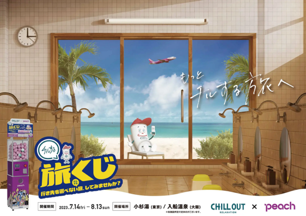 Endianが展開するリラクゼーションドリンクブランド「CHILL OUT(チルアウト)」は、低運賃で気軽な空の旅を届ける「Peach(ピーチ)」との初コラボレーション企画「チルする旅くじ」を発売する。「チルする旅くじ」のカプセル型自動販売機は、2023年7月14日〜8月13日の約1カ月間限定で、小杉湯(東京都杉並区)、入船温泉(大阪市西成区)の2か所に設置される。