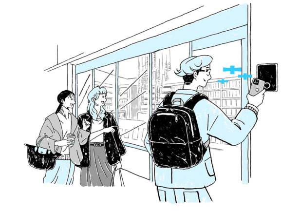 初回は店頭サインのQRコードを読み込んで会員証を発行し、アクセスコントロールシステム「TOBIRA」のリーダーに会員証のQRコードをかざして入店する。次回以降は、LINEから会員証を開くことができ、入店時・退店時にリーダーへかざす。