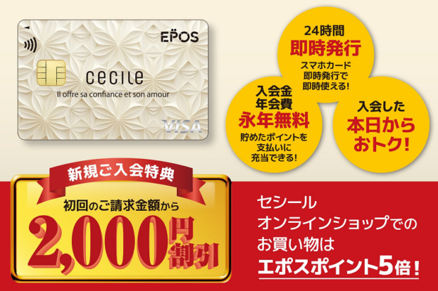 新規入会特典として、入会後4カ月以内に「セシールオンラインショップ」で利用すると、入会特典として利用代金から2,000円割引となる(セシールエポスカード利用で請求時に割引)、さらに、「セシールオンラインショップ」での利用ではいつもエポスポイントが5倍になる。