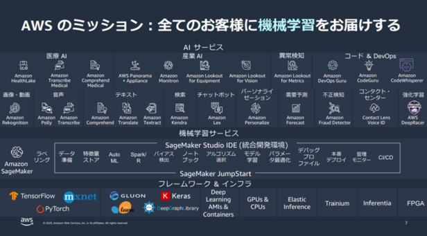 機械学習では、共通的な基盤を提供し、モデルの構築から実装を図っている。インフラのレイヤーとして、スケールすることを見越して提供することで、活用領域が広くなった際のコストを抑えられるという。結果として10万社の顧客がAWS上で機械学習を実行し、日本の金融機関も活用している。
