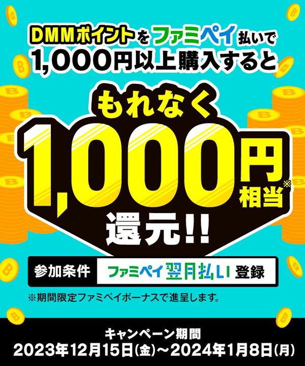 キャンペーン期間中に、DMMポイントを1,000円以上ファミペイ払いで購入すると、もれなく1,000円相当の期間限定ファミペイボーナスを進呈(ファミマデジタルワン)