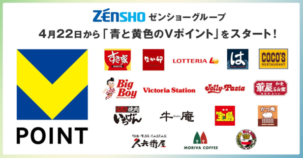 今回の取り組みは、「青と黄色のVポイント」として初の取り組みとなるそうだ。世界の1億店で貯まって使える「青と黄色のVポイント」をゼンショーグループの店舗で提供することで、顧客の店舗利用の機会創出を図るとともに、利便性向上に取り組むという。