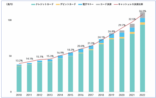 一般社団法人キャッシュレス推進協議会のデータ(図1)によると2021年のキャッシュレス決済比率は32.5%、2022年は36%となっており、2021年~2022 年にかけては 前年比+3.5%ptと成長が最も加速した。2023年には政府が当初掲げていた2025年までに40%という目標を早期達成する可能性もある。