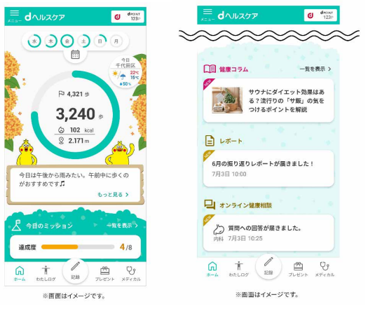 「d ヘルスケア」は日々の歩数や、体重・血圧・脈拍・体温を記録し管理できるほか、歩数ミッションや健康コラムミッションなどの健康習慣が身につくコンテンツを配信している。また、健康に関するさまざまな悩みを、チャットを通じて 24 時間いつでも医師に相談できるオンライン健康相談サービスの提供や市販薬の購入、オンライン処方箋受取、セルフケアクリニックとの連携により利用者の健康管理・増進をサポートしているという。