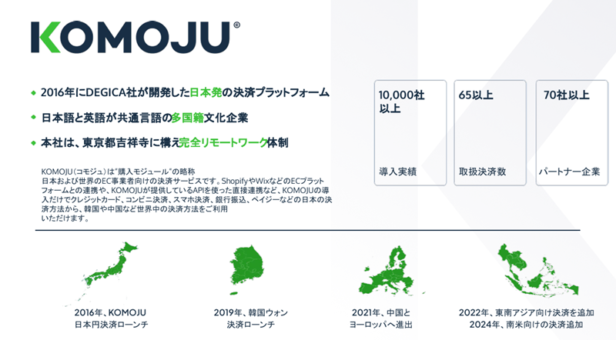 「KOMOJU」は2016年にサービスインした決済プラットフォームであり、日本および世界のEC事業者向けにサービスを提供している。ShopifyやWixなどのECプラットフォームとの連携や、KOMOJUが提供しているAPIを使った直接連携など、KOMOJUの導入だけでクレジットカード、コンビニ決済、スマホ決済、銀行振込、ペイジーなどの日本の決済方法から、韓国や中国など世界中の決済方法を利用できる。