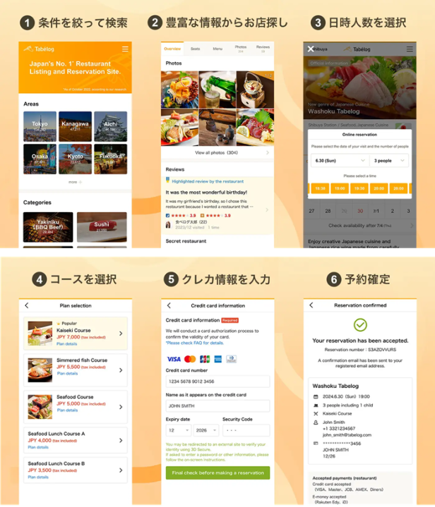 食べログに掲載されている詳細な店舗情報・写真・口コミといった豊富な情報を自動翻訳により多言語で提供するとともに、空席カレンダーから予約を完了できるようにしている。