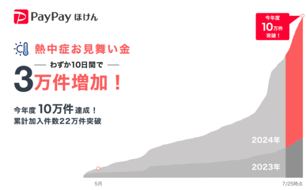 「熱中症お見舞い金」の今年度の加入件数が10万件突破(PayPay保険サービス/Zフィナンシャル/PayPay)