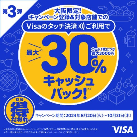 ビザ・ワールドワイド・ジャパン(Visa)は、2024年8月20日~10月31日まで実施される「大阪限定 Visaのタッチ決済キャッシュバックキャンペーン 第3弾」を開催している。