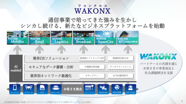 KDDIでは、KDDIビジョン2030の実現に向けた事業戦略として、5Gと生成AIを中心に置き、DX新サテライトグロース戦略を掲げている。AIデータの活用を強化して事業領域と顧客接点を拡大している。同社では、通信事業で培ってきた強みを生かし、KDDIは2024年5月から、新たなビジネスプラットフォーム「WAKONX(ワコンクロス)」を始動した。モビリティ、リテール、ロジスティクス、ブロードバンド、スマートシティ、BPOといった領域ごとに顧客と一緒にビジネスを伸ばしていく。業務DXソリューション、セキュアなデータ蓄積・分析、業界別ネットワークの最適化という3つを伸ばすことで、社会課題の解決を支援していく。パートナーとの共創を通じて、顧客の事業成長と社会課題の解決を目指す。