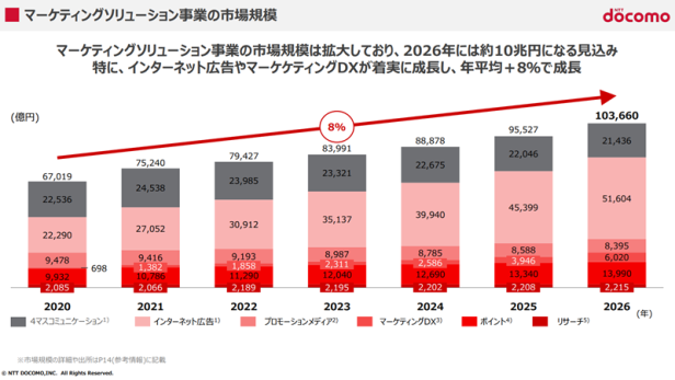 マーケティングソリューション事業の市場規模は年々拡大傾向にあり、2026年には約10兆円規模の市場になるとされる。特にインターネット広告やマーケティングDX市場が着実に成長する見込みで、マーケティングソリューション事業は年8%程度成長していくと考えているそうだ。今後成長が見込まれるマーケティングソリューション領域については、ドコモも収益の柱と位置づけて事業活動を強化している。