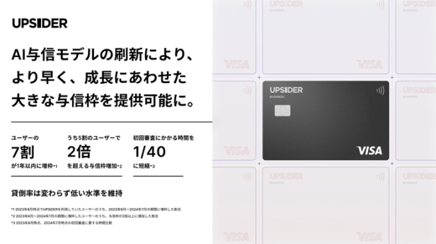 UPSIDERは、同社が提供する法人カード「UPSIDER」おいて、2023年8月にAI与信モデル刷新後、UPSIDER利用ユーザーの約7割が1年以内に増枠を実現したほか、うち半数以上のユーザーは当初の与信枠から2倍以上に増枠を実現したと発表した。