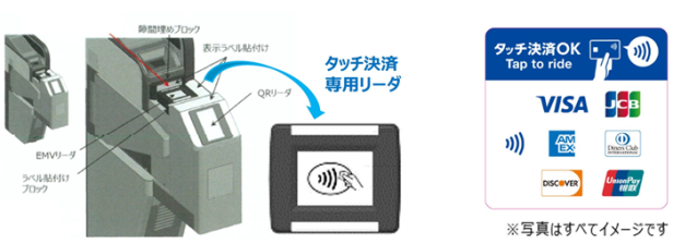 クレジットカードやデビットカード等のタッチ決済による乗車では、ICカードへのチャージが不要となり、利用者が手持ちのタッチ決済対応のカードまたは同カードが設定されたスマートフォン等を新たに自動改札機に設置する専用リーダにタッチすることで改札を通過できる。