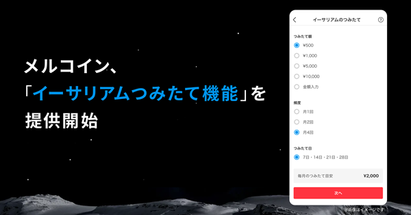 メルカリの子会社で、暗号資産やブロックチェーンに関するサービスの企画・開発を行うメルコインは、2024年10月22日より、メルカリアプリで設定でき、銀行からの自動引落しでイーサリアムをつみたてられる「イーサリアムつみたて機能」の提供を開始した。