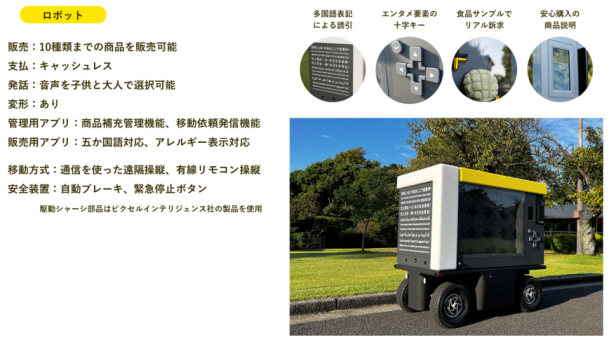 具体的に、工事不要で景観や自然を保持しながら、販売間口を増やすことができる、無人販売ロボットを提供する。ロボットは移動可能で、季節や天候、イベントなど需要の変化に合わせて柔軟に販売場所を変えることもできる。遠隔操作については、常時移動する必要がない運用であることから、自律走行やそのための事前準備等が不要と判断した結果、ロボットの本体やサービス運用のコスト優位性を考慮し、遠隔操縦のみで運用する。