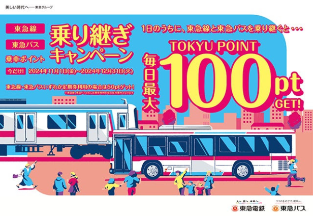 東急(株)グループにおいて「移動」を担う東急電鉄と東急バスが連携する同キャンペーンは、交通領域における顧客接点のさらなる拡充に加えて、沿線地域の「移動」を活性化させ持続的なエリア成長を実現することを目的として実施する。東急線と東急バスの両方を同日に利用し、いずれか一方もしくは両方を定期券区間外で利用した人に、1日最大100ポイント(100円相当)のTOKYU POINTを加算する。
