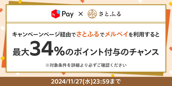 The post 「さとふる」へのネット決済導入開始、最大34%付与のキャンペーン実施(メルペイ) first appeared on ペイメントナビ.