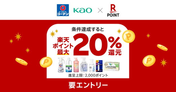同キャンペーンでは、キャンペーン期間中にエントリーして、「コーナン」の対象店舗で「楽天ポイントカード」を提示して1会計5,000円(税込)以上支払いをした人に、花王の全商品の購入金額(税込)に対して「楽天ポイント」を最大20%還元する。