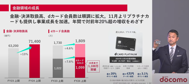 ドコモの「dカード」の会員数は1,800万件(2024年10月時点)を超えているが、中でも戦略的に強化してきた「dカードGOLD」は1,100万枚を突破している。その成長をさらに加速させるため、「dカード」の新たなラインアップとして、「dカードPLATINUM」の申込み受付を2024年11月25日9時から開始する。ドコモでは年間で対前年比20%超の増収を目指すという。