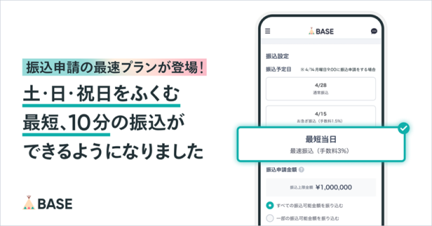 BASE運営するネットショップ作成サービス「BASE(ベイス)」は、「BASE」利用ショップのキャッシュフロー早期化をサポートするため、通常は売上金の振込申請から入金までに10営業日を要するところ、ストアフロント型ネットショップ作成サービスとして最速の最短10分で入金が完了する「最速振込」の提供を2025年4月15日より開始した。