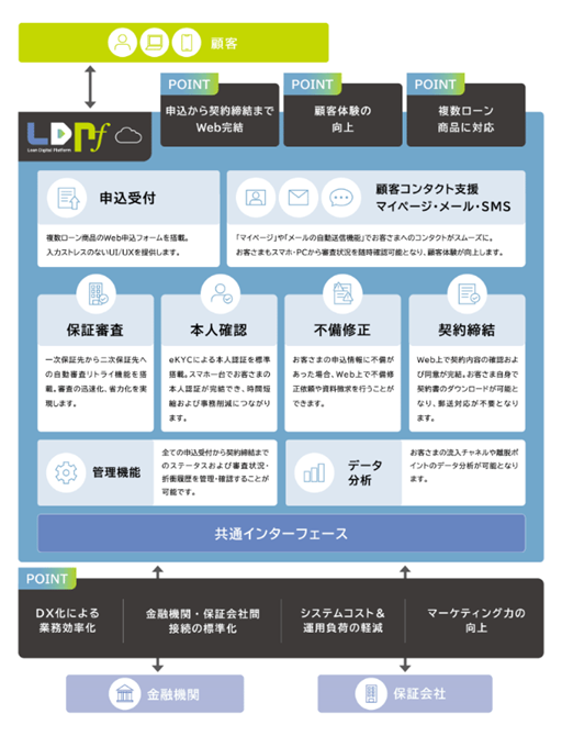 個人ローンは、商品ごとに保証会社が異なるケースが多いことや業務内容やシステムが各社各様などの理由から、紙事務や電話・FAXの使用などアナログ的な業務が残るなど、デジタル化による抜本的な業務改善が進まない状況にあった。同プラットフォームは、個人ローンに係る旧来業務全般のデジタル化と、それに伴うローン申込者の顧客体験の向上や事務効率化を目的にSMBCCFと共同開発したSaaS型のサービスで、2023年より展開している。