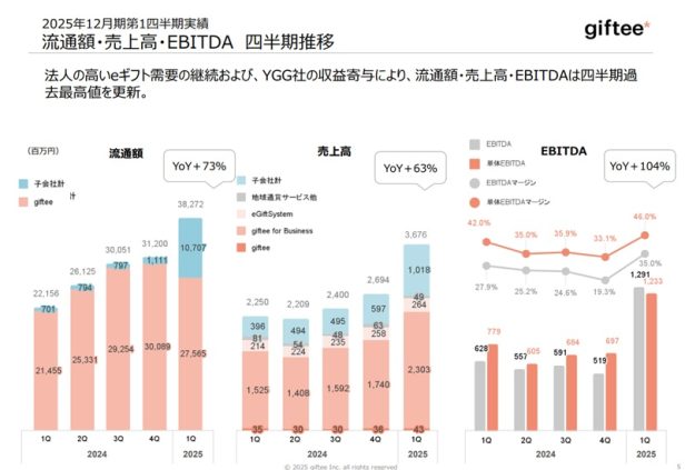 ギフティの2025年12月期第1四半期の流通額は382億円(前年同期比 +73%)、売上高 :3,676百万円(前年同期比 +63% )、EBITDA:1,291 百万円(前年同期比 +104% )となっている。
