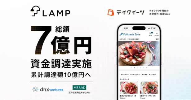飲食店やスイーツ店を中心に全国2,500店舗以上へ導入のテイクアウトの注文受付・管理SaaS「テイクイーツ」を提供するランプは既存投資家であるDNX Ventures、三井住友海上キャピタルを引受先とした第三者割当増資により、総額7億円の資金調達を実施した。