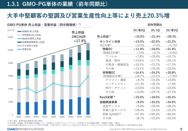 GMO-PGは、物販ECに加え、BaaS支援、海外展開における金融関連事業(マネーサービスビジネス)などが伸び、営業利益も好調に推移した。大手や中堅顧客が堅調に伸び、顧客1社あたりの売り上げ増も貢献した。オンライン決済や物販も市場平均を上回る成長を見せているという。