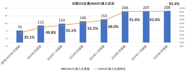 日経225企業は、2025年5月時点で208社(92.4%)が少なくとも1つのドメインでDMARCを導入しており、半年前の2024年11月(92.0%)からは0.4ポイントの増加であり、ほぼ横ばいで推移している。