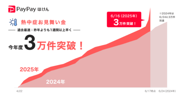 LINEヤフーのグループ会社であるPayPay保険サービスとZフィナンシャル株式会社、PayPayは、キャッシュレス決済サービス「PayPay」内の「PayPayほけん」ミニアプリにおいて、2025年4月22日より提供を再開した「熱中症お見舞い金」の今年度の加入件数が、昨年よりも1週間以上早く、かつ、サービス提供開始以降最速で3万件を突破したと発表した。