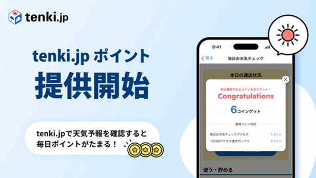 一般財団法人 日本気象協会は、天気予報専門メディア「tenki.jp」にて、「tenki.jp メンバーシップ」会員向けポイントプログラム「tenki. jp ポイント」の提供を2025年6月16日から開始した。