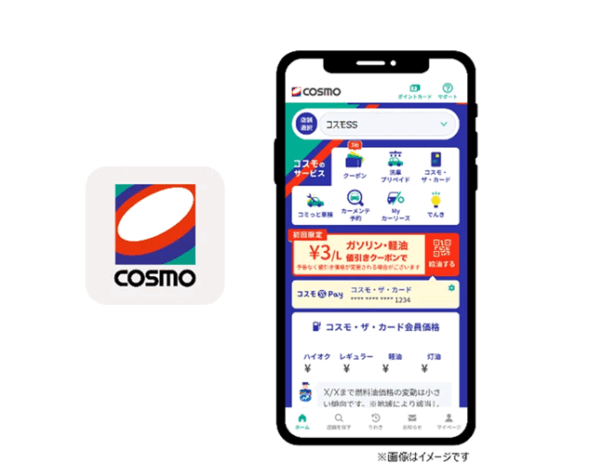【コスモの公式】アプリのアイコン(左)とホーム画面(右)(コスモ石油マーケティング)