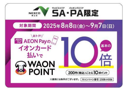 今回の AEON Pay 導入を記念し、NEXCO 東日本管内のサービスエリアおよびパーキングエリア限定で「AEON Pay ご利用キャンペーン」を実施するという。2025年8月8日~9月7日の期間中、NEXCO 東日本管内の「AEON Pay」が使えるサービスエリアおよびパーキングエリアにて、AEON Pay のイオンカード払いを利用すると、WAON POINT を基本の10倍進呈するという。
