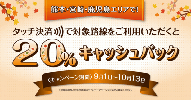 同キャンペーン期間中、対象の鉄道、バス、フェリーをタッチ決済で乗車すると、期間中何回でも運賃の20%を即時キャッシュバックする。対象の交通機関は、熊本市電、九州産交バス、産交バス、熊本電気鉄道、熊本都市バス、熊本バス、宮崎交通、鹿児島交通、南国交通、桜島フェリーとなる。