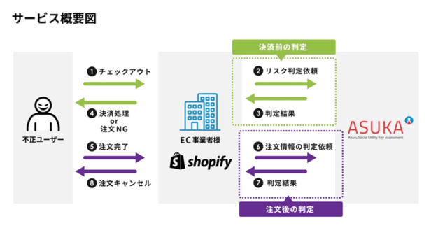 同社は、EC業界における不正利用の被害に対応するソリューションとして「ASUKA」を提供している。今回提供を開始したShopifyアプリにより、Shopify利用事業者はアプリのインストールと簡易な設定だけでASUKAを導入でき、決済における不正検知や、チェックアウト時の制御・自動キャンセル処理ができるようになるという。