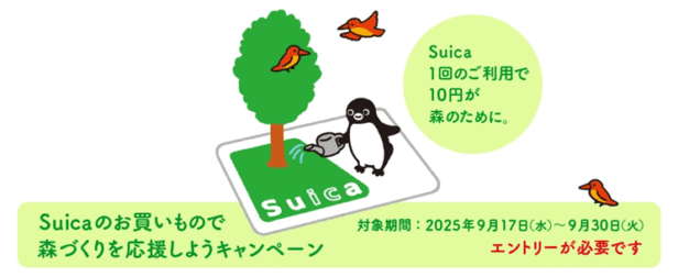 JR 東日本クロスステーション(JR-Cross)は、2025年9月末のSDGs 週間に合わせ、9月17日 から30日までの14日間、「Suica のお買いもので森づくりを応援しよう」キャンペーンを行う。