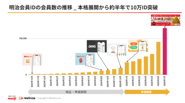 明治の出資を受け、明治のマーケティングDX推進を担うWellnizeは、本格運用開始から7カ月目の2025年7月に10万人を突破した「明治会員ID」において、広告効果の向上やCPA(顧客獲得単価)の改善などの事例を同社公式noteに公開した。