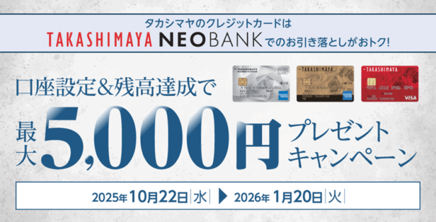 同対象期間中、タカシマヤのクレジットカードの引き落とし先に、高島屋ネオバンク(住信SBIネット銀行 タカシマヤ支店)の口座を設定する必要がある。また、2026年3月4日までに、タカシマヤのクレジットカードでの利用代金が高島屋ネオバンク口座から初めて引き落としされることが条件だ。これにより、1,500円をプレゼントする。また、これを満たし、2026年1月20日時点で、高島屋ネオバンク口座の円普通預金残高が5万円 以上ある場合、3,500円をプレゼントする。