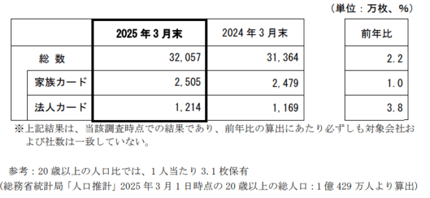 これによると、2025年3月末のクレジットカード発行枚数(調査回答社数 243 社)は、3億2,057万枚で、前年比 2.2%の増加となった。内数として、家族カードは 2,505万枚で前年比 1.0%の増加、法人カードは 1,214万枚で前年比 3.8%の増加となった。