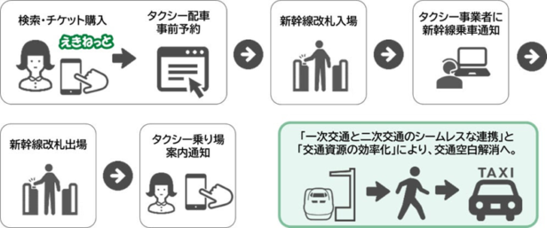 同実証では、「交通空白」解消を目的に新幹線予約とタクシー配車予約を連携させる全国初のサービスを検証する。利用者の駅到着後の待ち時間を解消し、快適な移動体験を提供するとともに、タクシー事業者の待機時間を削減し、地域交通の持続可能性向上を目指すという。