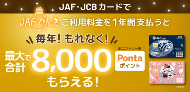 条件は、My JCBの特設エントリーフォームに事前エントリーしていること、「JAFでんき」を新規開通またはすでに利用していることとなる。また、クレジットカード機能付きJAF会員証(JAFカード)の利用者は、通常特典とあわせて年間最大8,000Pontaポイントを還元するという。