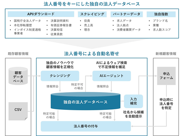 同サービスは、表記揺れを含む法人顧客リストを法人番号ベースで一意に特定・統合し、各企業サイトの更新情報や求人広告の推移といった外部データを付加するもの。これにより、法人営業における顧客管理の効率化や与信管理の自動化を支援するという。